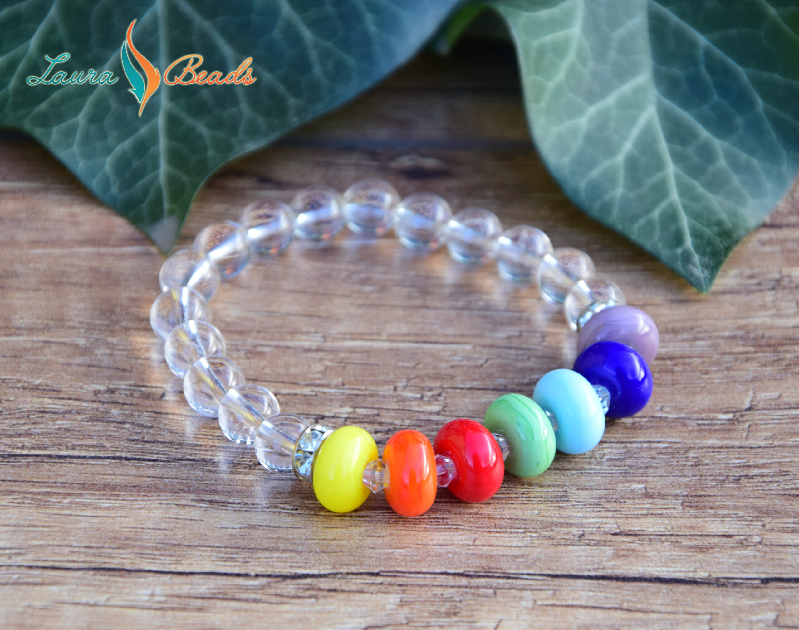 A 7 fő csakra színeiből egyedileg olvasztottam a 7 db üveggyöngyöt, ehhez adtam hozzá a 8 mm-es hegyikristály ásványokat.