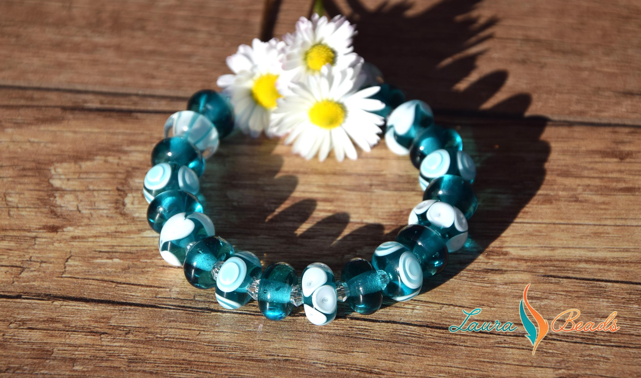 Saját készítésű kékeszöld és fehér színű mintás lámpagyöngyökből és cseh üveggyöngyökből készült karkötő.